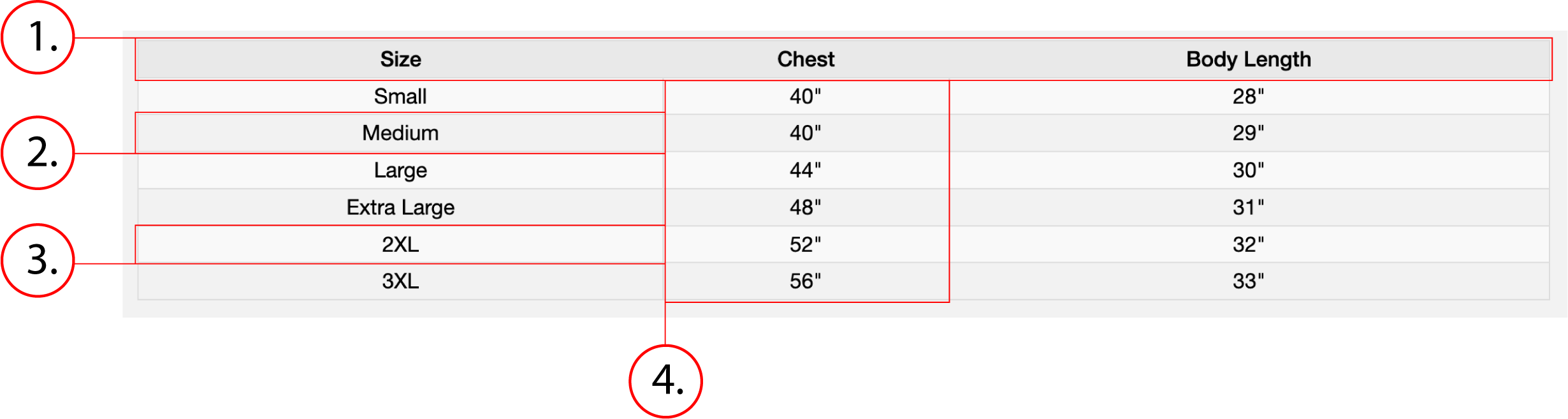 | Size | Chest | Body Length |